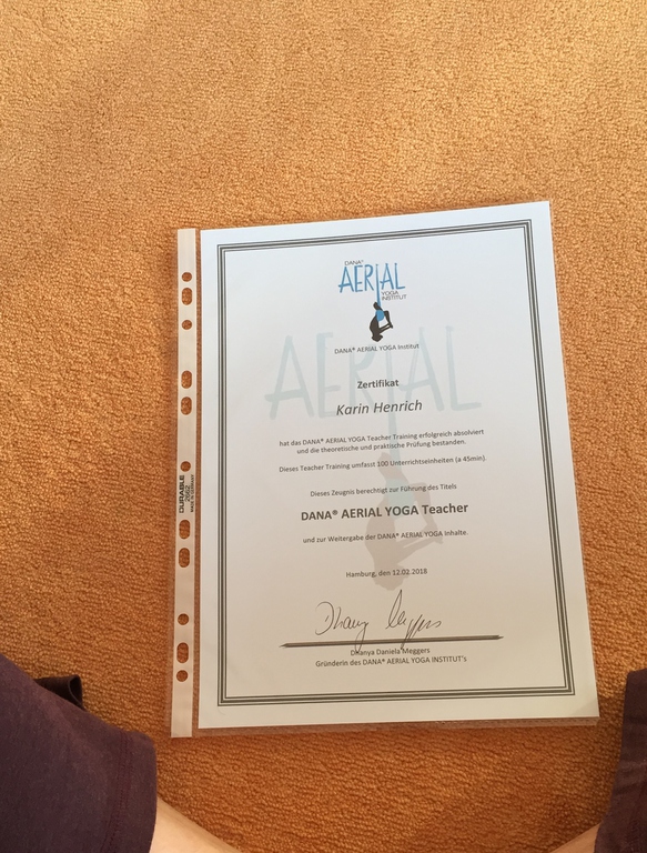 Dana® Aerial Yoga ist eine neue Art Yoga zu erleben. Dana ist Sanskrit und bedeutet Geschenk. Es ist für Dich ein Geschenk in dieser Art von Yoga Dein ganzes Körpergewicht abgeben zu können, loslassen zu üben und Vertrauen zu entwickeln. Asanas (Körperübungen aus dem Yoga) die Du noch nie konntest (evtl. Skorpion) fallen dir im Tuch ganz leicht. Du darfst schwerelos sein. Dein Tuch ist Dein Partner, der Dir dieses Geschenk macht. Tiefe Muskelanspannungen können sich lösen und das meistens ohne viel Anstrengung - das Tuch trägt Dich. (Größe 4mx2,60m, Traglast 300 kg) Die Gelenke, die Wirbelsäule wird hervorragend gestreckt und Dein Beckenboden trainiert. Und dabei steht der Spaß, das Spiel im Vordergrund. Es ist wieder so, als ob Du Dich geschmeidig und in Deiner ganzen Größe bewegst.